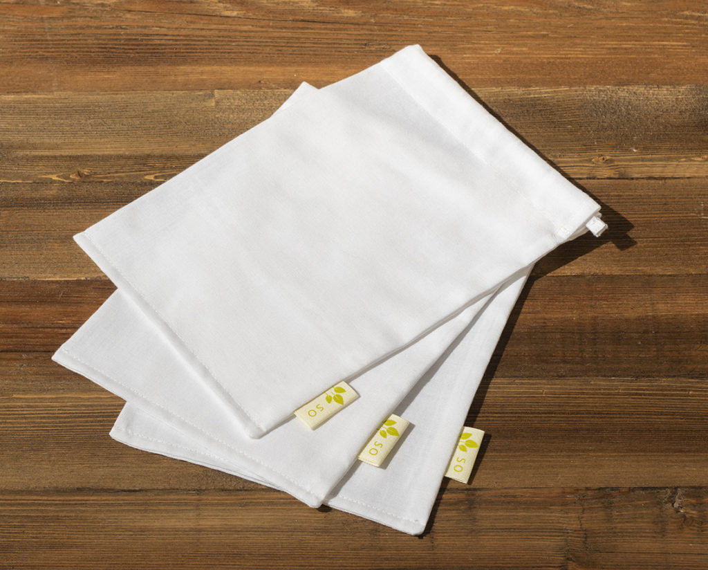 また、関西産サラシ100%で作った様々なサイズの巾着袋→キノコ袋、バゲット袋、ネギ袋など も販売しています。