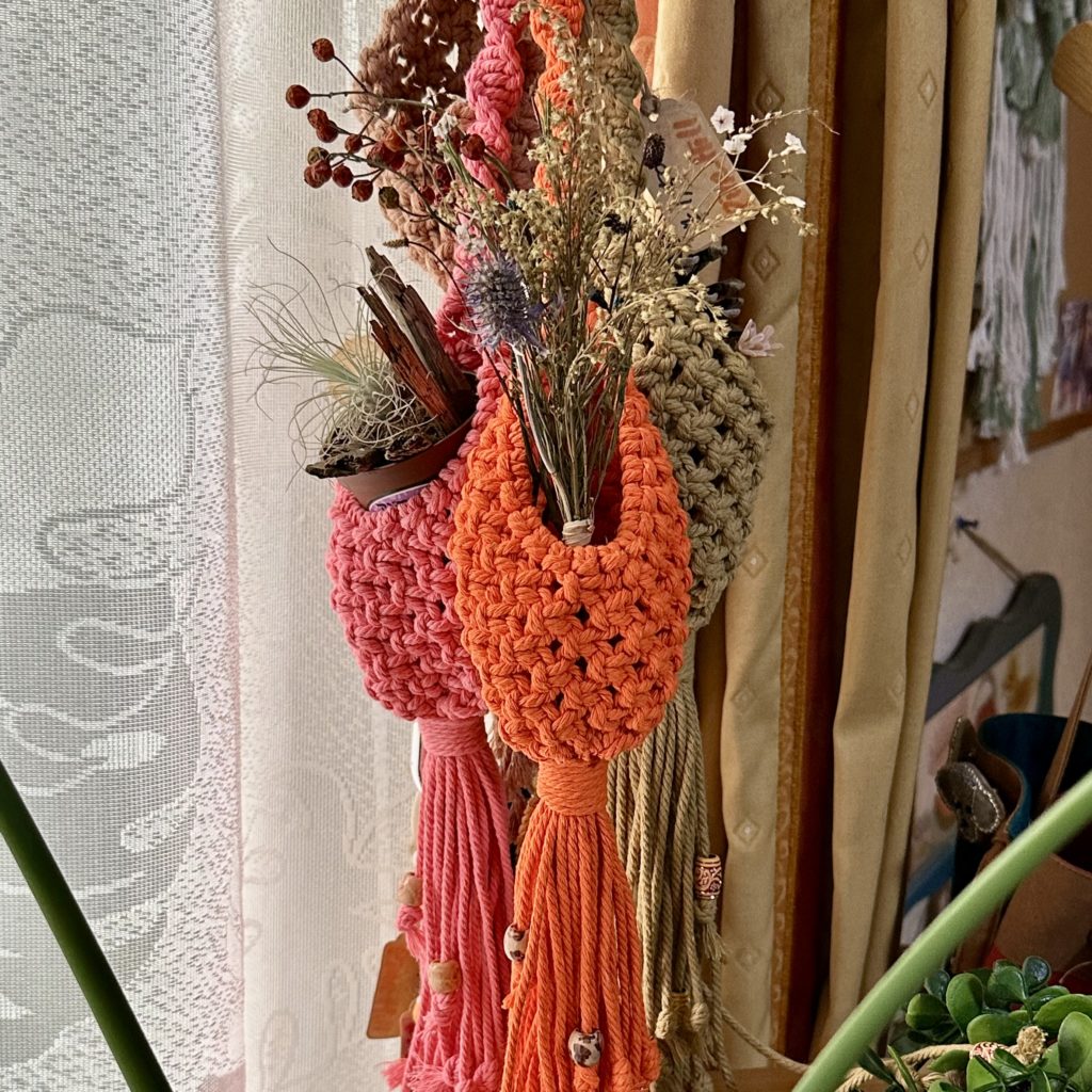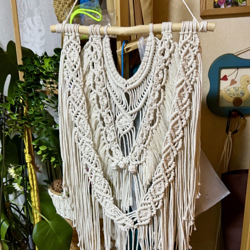 マクラメ編みは、壁紙の模様替えはなかなか出来ないのでは?と言う点からタペストリーであったり、植物のバンギングだったり。心に癒しをプラスできます。